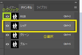 このとき、表示チャンネルが「レッド」のみになってしまうので、「RGB」の左の目マークをクリックし、全チャンネルが表示されるようにしてください。